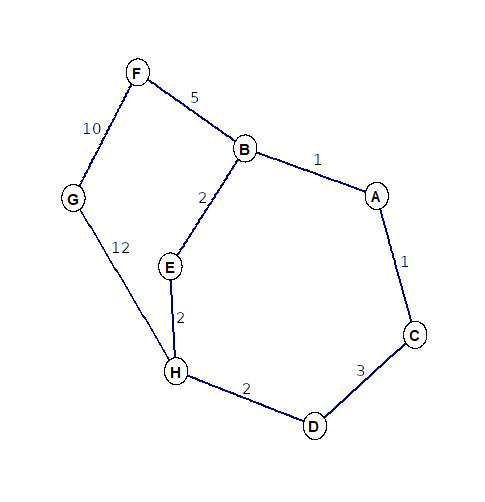 In my research I usually apply graph theoretical methods in a geo-spatial context. And in that field I would not consider the two stage procedure a viable choice when compared with properly defined transition functions. I guess that is why I am not a fan. Let me explain how the proposed transition function replaces the two stage procedure without changing the results. Consider the graph attached to this e-mail. The numbers denote the quantity of joint papers. What is the shortest path between A and H? There are three potential connections: A-C-D-H, A-B-E-H and A-B-F-G-H. With the inverse transition function (W_{i,j} = N_{i,j}{-1}) the shortest path would be A-B-F-G-H because its sum of edge weights (1.38) is lower than in the other two cases (1.83 and 2). However, in your two stage binary process this path would have been ruled out in the first stage because there are five authors on it, compared two four authors in the other two options. Your procedure would choose A-C-D-H. It is one of the two shortest paths (A-C-D-H and A-B-E-H) in the binary case. And it is the shorter one among the two when weighted by the number of papers. The proposed transition function W_{i,j} = 1 - (N_{i,j} * 0.001) results in the same shortest path. A-C-D-H (length: 2.994) is shorter than A-B-E-H (length: 2.995) and A-B-F-G-H (length: 3.972). This transition function is the binary application, minimizing the quantity of authors, with a tiny adjustment for the number of papers selecting the shortest path among the binary case options. Is that clear? Christian Düben Research Associate Chair of Macroeconomics Hamburg University Von-Melle-Park 5, Room 3102 20146 Hamburg Germany +49 40 42838 1898 christian.dueben@uni-hamburg.de http://www.christian-dueben.com -----Original Message----- From: Thomas Krichel <krichel@openlib.org> Sent: Dienstag, 11. August 2020 11:51 To: Düben, Christian <Christian.Dueben@uni-hamburg.de> Cc: CollEc Run <collec-run@lists.openlib.org> Subject: Re: New CollEc Düben, Christian writes